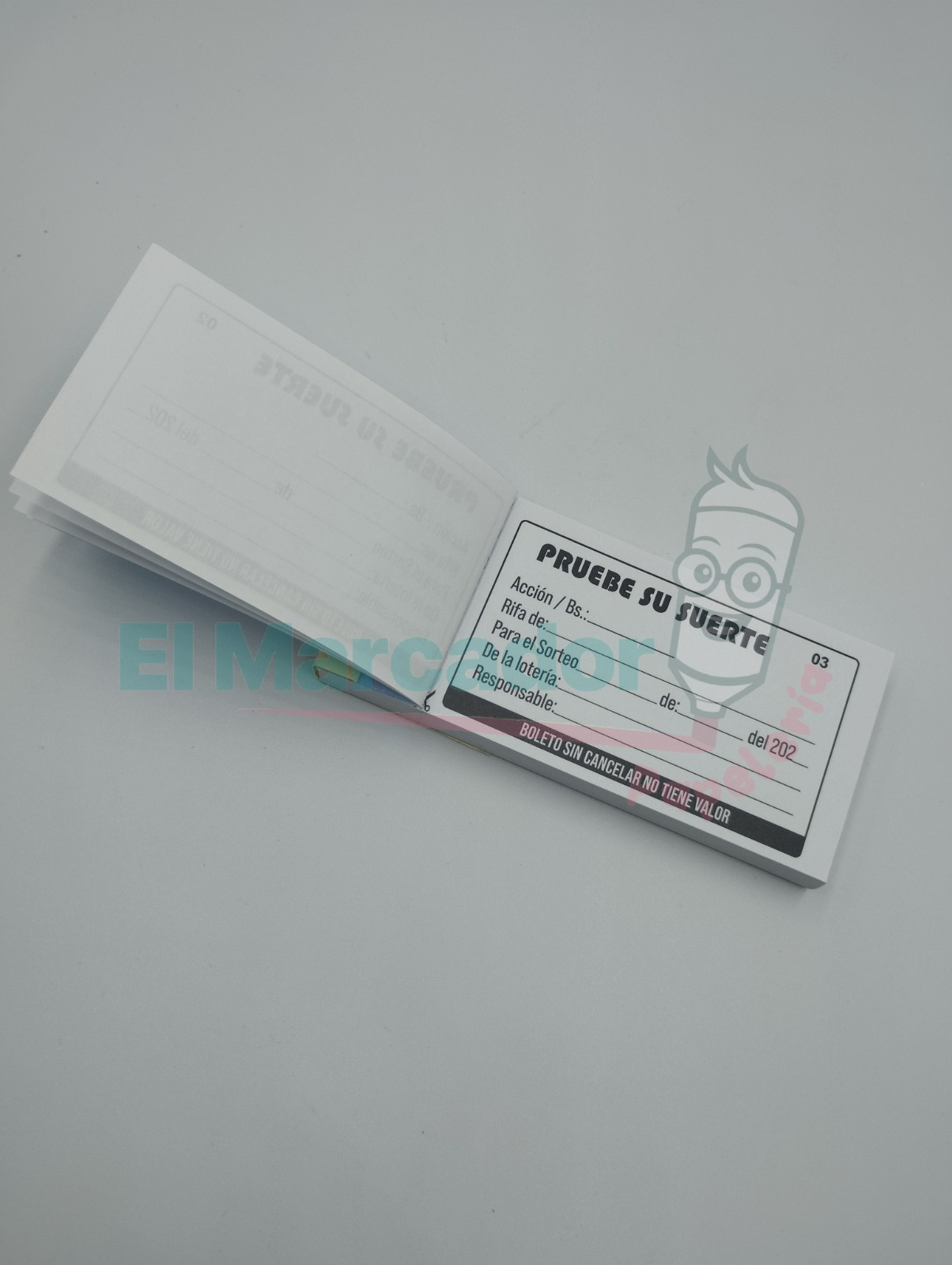 | Color | Los talonarios pueden venir en colores de papel surtidos (blanco, amarillo, azul, rosado, etc.), para ayudar a diferenciar entre bloques o sorteos. |