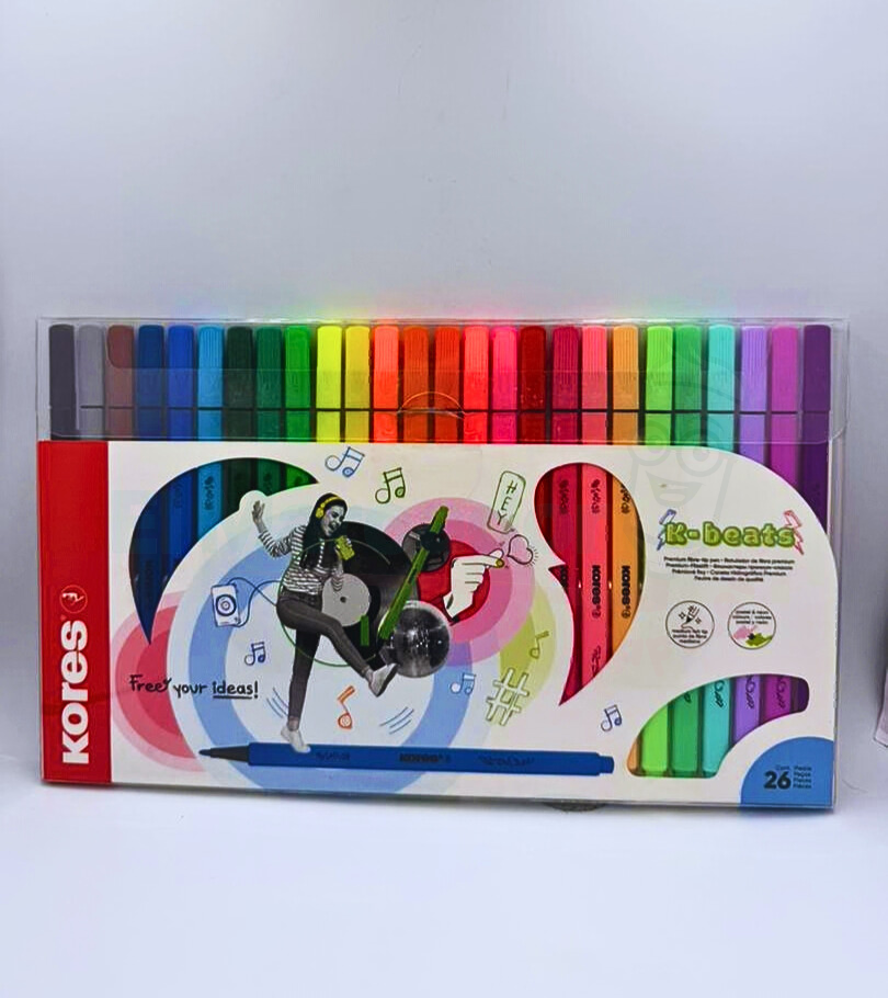 La línea K-Beats de Kores representa la excelencia en instrumentos de escritura y coloreado con fibra. Este estuche de 26 unidades ha sido desarrollado para ofrecer una experiencia de dibujo fluida, donde la intensidad del pigmento y la precisión de la punta se combinan para satisfacer tanto a estudiantes de diseño como a entusiastas del arte y el lettering.